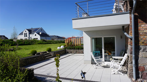 Direkt vom Wohnraum geht es raus in die Sonne auf die grosse Terasse. Um die Ecke befindet sich der Autostellplatz, sowie die Möglichkeit eigene Fahrräder unterzustellen oder auszuleihen
