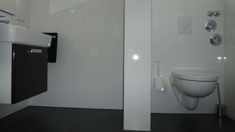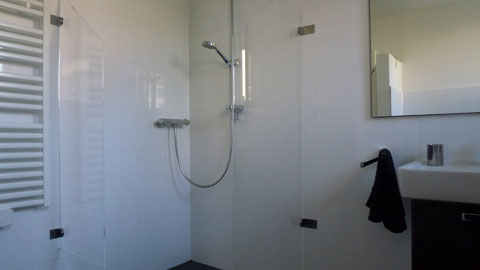 Bequem ebenerdig sich unter die Dusche stellen und sich mit einem gewärmten Handtuch abtrocknen.