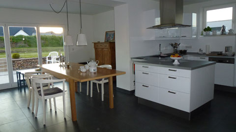 Die Küche ist sehr gut ausgestattet. Kochinsel und Esstisch befinden sich im Wohnraum.
